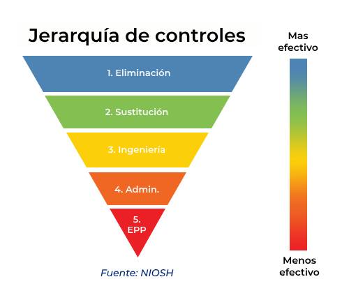 Una vez que se ha examinado cuidadosamente la actividad y que el riesgo ha sido evaluado, se puede continuar a crear procedimientos para reducir el riesgo, llamados medidas de control. El Instituto Nacional (estadounidense) para la Seguridad y Salud Ocupacional[6] clasifica las formas en las que se deben reducir los riesgos en la Jerarquía de controles. Arriba de la lista encontrará los controles más efectibos; en la parte de abajo encontrará los controles menos efectivos: