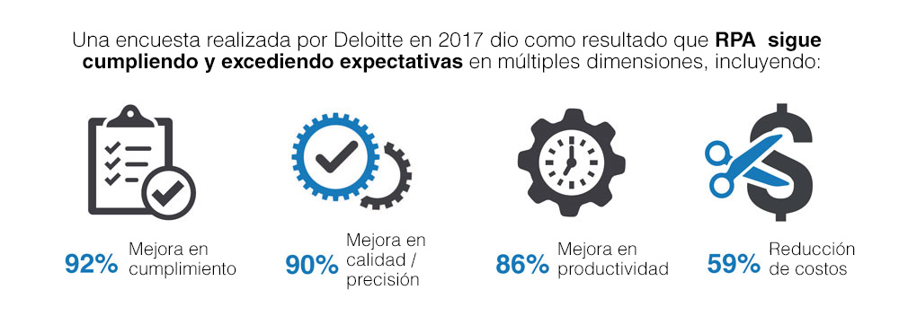Figura 1. Datos de desempeño de RPA. Adaptado de “The robots are ready. Are you?” por Deloitte, p. 2. Recuperado de www.deloitte.com/us/rpasurvey. Copyright 2018 por Deloitte Development LLC.